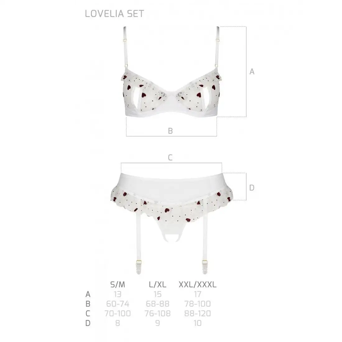 НАБОР LOVELIA доступен в размерах L/XL, что делает его подходящим для разных типов телосложения. Белый цвет добавляет невинности вашему образу, оставаясь при этом неоспоримо соблазнительным.